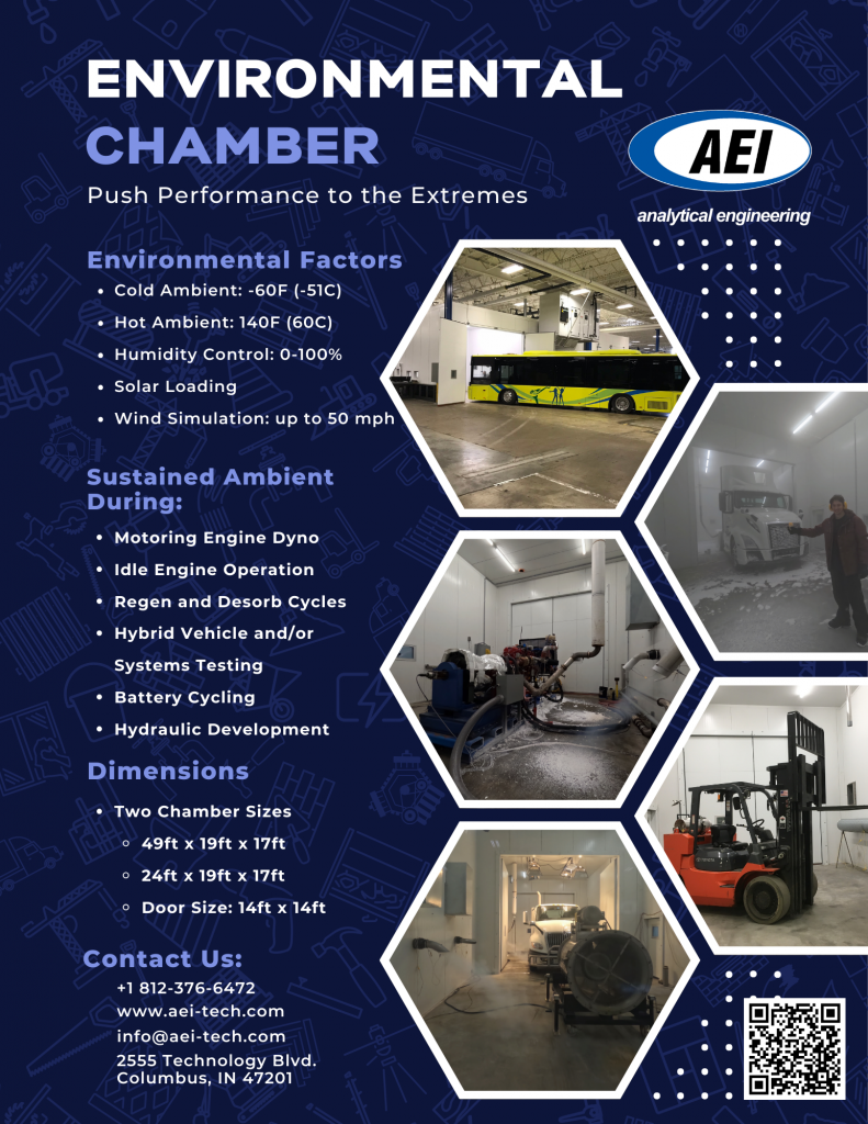 At AEI, our state-of-the-art environmental chamber testing facilities are designed to meet the rigorous demands of modern vehicle and component testing. Our chambers provide an unparalleled environment for simulating extreme temperature conditions, humidity targets, solar loading, and wind simulation to ensure that your products perform reliably in the harshest climates.